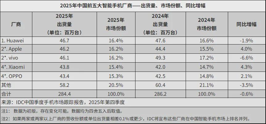 现在,5 年之后,华为手机终于重回中国智能手机市场第一。三家主流市场研究机构 IDC、Omdia 以及 Counterpoint 公布的统计数据均显示,在 2025 年中国智能手机全年出货量同比微降的趋势下,华为超越苹果拿下市场第一。