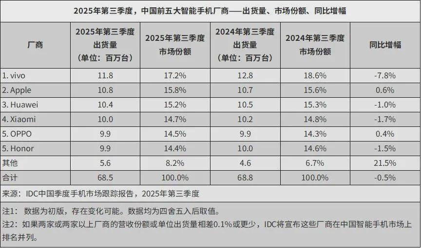 荣耀的销售曲线的确如荣耀管理层预期般有所抬升。IDC 数据显示,2025 年第三季度,荣耀终于重回中国智能手机市场前五,市占率达到 14.4%,与 OPPO 并列第五(OPPO 当季市占率为 14.5%)。