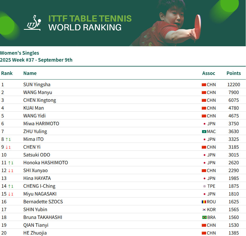 女单方面,孙颖莎12200分居首,王曼昱、陈幸同、蒯曼、王艺迪分列前五。