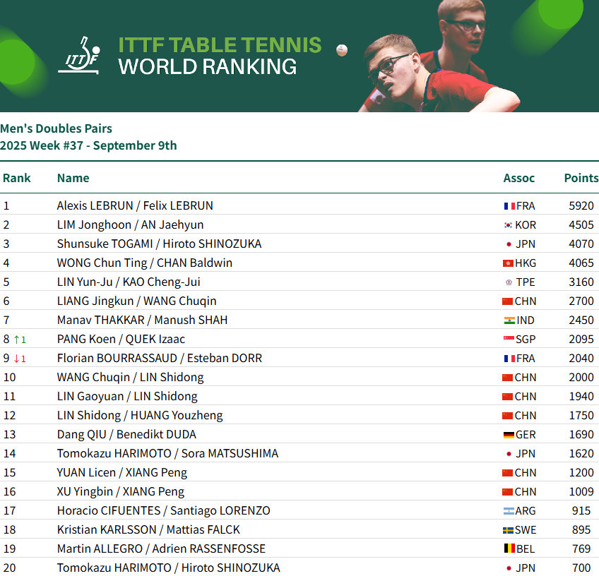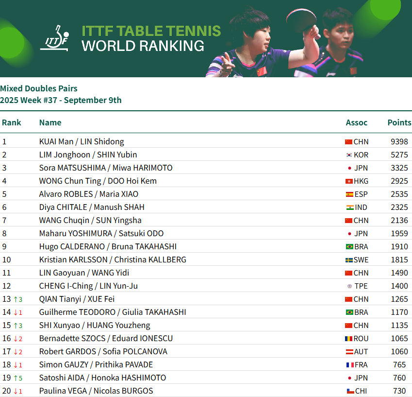 央视网消息:北京时间9月9日,国际乒联公布了2025年第37周的最新排名,中国球员林诗栋和孙颖莎继续占据男单和女单世界第一的位置,其中孙颖莎连续165周占据榜首,王曼昱/蒯曼排名女双第一,蒯曼/林诗栋位居混双榜首。
