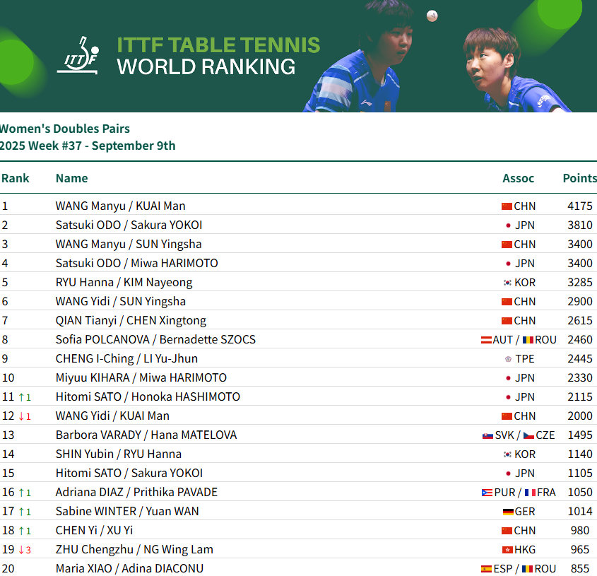 女双方面,王曼昱/蒯曼组合第一,王曼昱/孙颖莎组合第三,王艺迪/孙颖莎组合第六,钱天一/陈幸同组合第七。